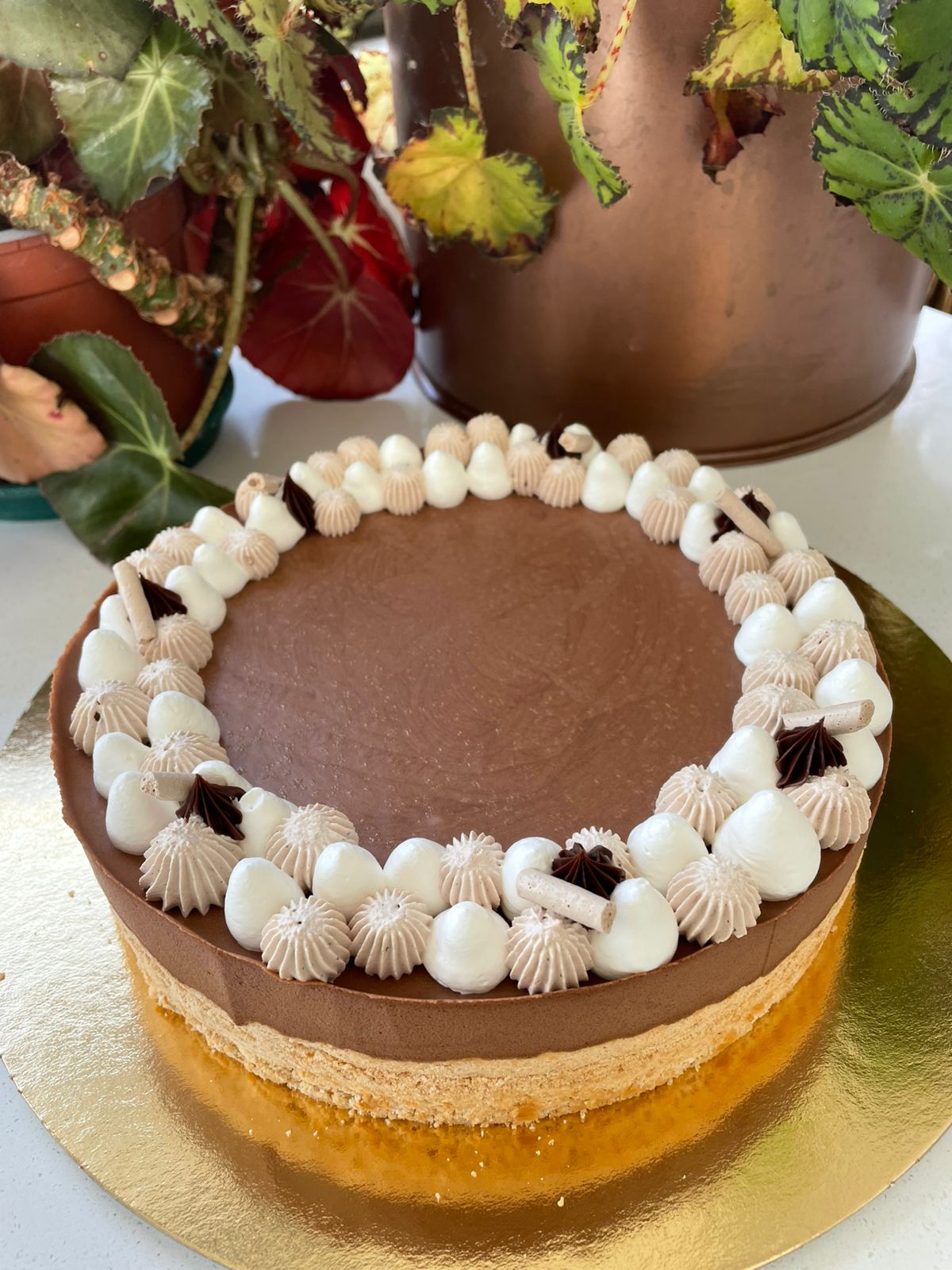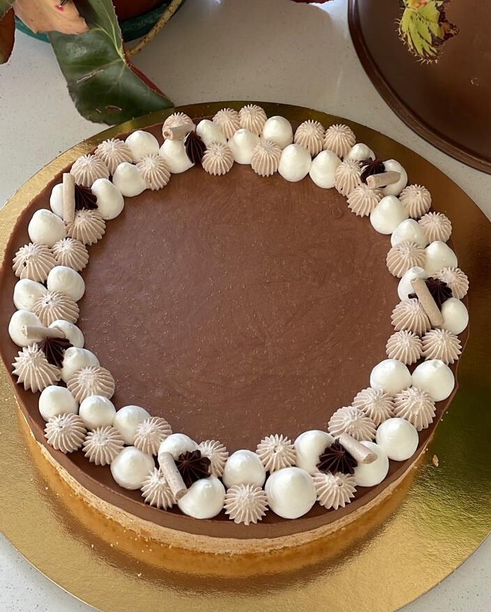 Merengue de almendras relleno con mousse de chocolate. Sin gluten y sin lactosa. Ingredientes: Harina de almendras, huevo, azúcar, chocolate, crema sin lactosa, leche sin lactosa, jalea.